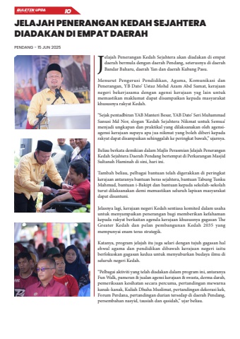 Jelajah Penerangan Kedah Sejahtera akan diadakan di empat daerah bermula dengan daerah Pendang, seterusnya di daerah Bandar Baharu, daerah Yan dan daerah Kubang Pasu.Menurut Pengerusi Pendidikan, Agama, Komunikasi dan Penerangan, YB Dato%u2019 Ustaz Mohd Azam Abd Samat, kerajaan negeri bekerjasama dengan agensi kerajaan yag lain untuk memastikan maklumat dapat disampaikan kepada masyarakat khususnya rakyat Kedah.%u201cSejak pentadbiran YAB Manteri Besar, YAB Dato%u2019 Seri Muhammad Sanusi Md Nor, slogan %u2018Kedah Sejahtera Nikmat untuk Semua%u2019 menjadi ungkapan dan praktikal yang dilaksanakan oleh agensiagensi kerajaan supaya apa jua nikmat yang boleh diberi kepada rakyat dapat disampaikan sehinggalah ke peringkat bawah,%u201d ujarnya.Beliau berkata demikian dalam Majlis Perasmian Jelajah Penerangan Kedah Sejahtera Daerah Pendang bertempat di Perkarangan Masjid Sultanah Haminah di sini, hari ini.Tambah beliau, pelbagai bantuan telah digerakkan di peringkat kerajaan antaranya bantuan beras sejahtera, bantuan Tabung Tunku Mahmud, bantuan i-Bakipt dan bantuan kepada sekolah-sekolah turut dilaksanakan demi memastikan seluruh lapisan masyarakat dapat disantuni.Jelasnya lagi, kerajaan negeri Kedah sentiasa komited dalam usaha untuk menyampaikan penerangan bagi memberikan kefahaman kepada rakyat berkaitan agenda kerajaan khususnya gagasan The Greater Kedah dan pelan pembangunan Kedah 2035 yang mempunyai enam teras strategik.Katanya, program jelajah itu juga selari dengan tujuh gagasan hal ehwal agama dan pendidikan dibawah kerajaan negeri iaitu berfokuskan gagasan kedua untuk menyuburkan budaya ilmu di seluruh negeri Kedah.%u201cPelbagai aktiviti yang telah diadakan dalam program ini, antaranya Fun Walk, pameran & jualan agensi kerajaan & swasta, derma darah, pemeriksaan kesihatan secara percuma, pertandingan mewarna kanak-kanak, Kuliah Dhuha Muslimat, pertandingan dekorasi kek, Forum Perdana, pertandingan durian tersedap di daerah Pendang, persembahan nasyid, tausiah dan qasidah,%u201d ujar beliau.JELAJAH PENERANGAN KEDAH SEJAHTERA DIADAKAN DI EMPAT DAERAHPENDANG - 15 JUN 2025BULETIN UPDA EDISI JUN 2025 10