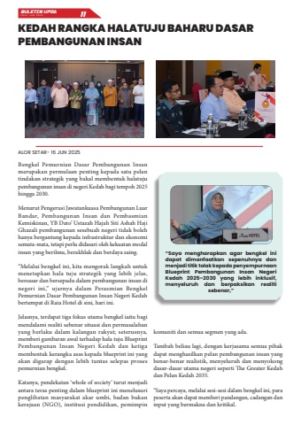 Bengkel Pemurnian Dasar Pembangunan Insan merupakan permulaan penting kepada satu pelan tindakan strategik yang bakal membentuk halatuju pembangunan insan di negeri Kedah bagi tempoh 2025 hingga 2030.Menurut Pengerusi Jawatankuasa Pembangunan Luar Bandar, Pembangunan Insan dan Pembasmian Kemiskinan, YB Dato%u2019 Ustazah Hajah Siti Ashah Haji Ghazali pembangunan sesebuah negeri tidak boleh hanya bergantung kepada infrastruktur dan ekonomi semata-mata, tetapi perlu didasari oleh kekuatan modal insan yang berilmu, berakhlak dan berdaya saing.%u201cMelalui bengkel ini, kita mengorak langkah untuk menetapkan hala tuju strategik yang lebih jelas, bersasar dan bersepadu dalam pembangunan insan di negeri ini,%u201d ujarnya dalam Perasmian Bengkel Pemurnian Dasar Pembangunan Insan Negeri Kedah bertempat di Raia Hotel di sini, hari ini.Jelasnya, terdapat tiga fokus utama bengkel iaitu bagi mendalami realiti sebenar situasi dan permasalahan yang berlaku dalam kalangan rakyat; seterusnya, memberi gambaran awal terhadap hala tuju Blueprint Pembangunan Insan Negeri Kedah dan ketiga membentuk kerangka asas kepada blueprint ini yang akan digarap dengan lebih tuntas selepas proses pemurnian bengkel.Katanya, pendekatan %u2018whole of society%u2019 turut menjadi antara teras penting dalam blueprint ini menelusuri penglibatan masyarakat akar umbi, badan bukan kerajaan (NGO), institusi pendidikan, pemimpin komuniti dan semua segmen yang ada.Tambah beliau lagi, dengan kerjasama semua pihak dapat menghasilkan pelan pembangunan insan yang benar-benar realistik, menyeluruh dan menyokong dasar-dasar utama negeri seperti The Greater Kedah dan Pelan Kedah 2035.%u201cSaya percaya, melalui sesi-sesi dalam bengkel ini, para peserta akan dapat memberi pandangan, cadangan dan input yang bermakna dan kritikal.KEDAH RANGKA HALATUJU BAHARU DASAR PEMBANGUNAN INSANALOR SETAR- 16 JUN 2025BULETIN UPDA EDISI JUN 2025 11%u201cSaya mengharapkan agar bengkel ini dapat dimanfaatkan sepenuhnya dan menjadi titik tolak kepada penyempurnaan Blueprint Pembangunan Insan Negeri Kedah 2025%u20132030 yang lebih inklusif, menyeluruh dan berpaksikan realiti sebenar,%u201d
