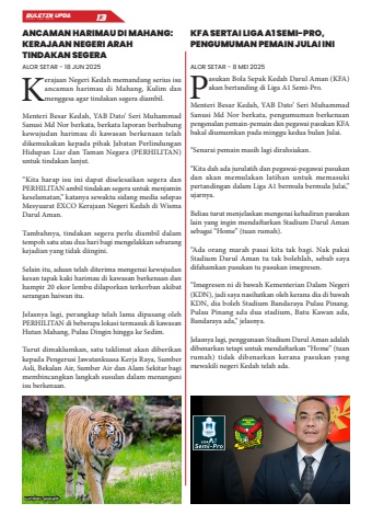 Kerajaan Negeri Kedah memandang serius isu ancaman harimau di Mahang, Kulim dan menggesa agar tindakan segera diambil.Menteri Besar Kedah, YAB Dato%u2019 Seri Muhammad Sanusi Md Nor berkata, berkata laporan berhubung kewujudan harimau di kawasan berkenaan telah dikemukakan kepada pihak Jabatan Perlindungan Hidupan Liar dan Taman Negara (PERHILITAN) untuk tindakan lanjut.%u201cKita harap isu ini dapat diselesaikan segera dan PERHILITAN ambil tindakan segera untuk menjamin keselamatan,%u201d katanya sewaktu sidang media selepas Mesyuarat EXCO Kerajaan Negeri Kedah di Wisma Darul Aman.Tambahnya, tindakan segera perlu diambil dalam tempoh satu atau dua hari bagi mengelakkan sebarang kejadian yang tidak diingini.Selain itu, aduan telah diterima mengenai kewujudan kesan tapak kaki harimau di kawasan berkenaan dan hampir 20 ekor lembu dilaporkan terkorban akibat serangan haiwan itu.Jelasnya lagi, perangkap telah lama dipasang oleh PERHILITAN di beberapa lokasi termasuk di kawasan Hutan Mahang, Pulau Dingin hingga ke Sedim.Turut dimaklumkan, satu taklimat akan diberikan kepada Pengerusi Jawatankuasa Kerja Raya, Sumber Asli, Bekalan Air, Sumber Air dan Alam Sekitar bagi membincangkan langkah susulan dalam menangani isu berkenaan.Pasukan Bola Sepak Kedah Darul Aman (KFA) akan bertanding di Liga A1 Semi-Pro.Menteri Besar Kedah, YAB Dato%u2019 Seri Muhammad Sanusi Md Nor berkata, pengumuman berkenaan pengenalan pemain-pemain dan pegawai pasukan KFA bakal diumumkan pada minggu kedua bulan Julai.%u201cSenarai pemain masih lagi dirahsiakan.%u201cKita dah ada jurulatih dan pegawai-pegawai pasukan dan akan memulakan latihan untuk memasuki pertandingan dalam Liga A1 bermula bermula Julai,%u201d ujarnya.Beliau turut menjelaskan mengenai kehadiran pasukan lain yang ingin mendaftarkan Stadium Darul Aman sebagai %u201cHome%u201d (tuan rumah).%u201cAda orang marah pasai kita tak bagi. Nak pakai Stadium Darul Aman tu tak bolehlah, sebab saya difahamkan pasukan tu pasukan imegresen.%u201cImegresen ni di bawah Kementerian Dalam Negeri (KDN), jadi saya nasihatkan oleh kerana dia di bawah KDN, dia boleh Stadium Bandaraya Pulau Pinang. Pulau Pinang ada dua stadium, Batu Kawan ada, Bandaraya ada,%u201d jelasnya.Jelasnya lagi, penggunaan Stadium Darul Aman adalah dibenarkan tetapi untuk mendaftarkan %u201cHome%u201d (tuan rumah) tidak dibenarkan kerana pasukan yang mewakili negeri Kedah telah ada.ANCAMAN HARIMAU DI MAHANG: KERAJAAN NEGERI ARAH TINDAKAN SEGERAKFA SERTAI LIGA A1 SEMI-PRO, PENGUMUMAN PEMAIN JULAI INIALOR SETAR - 18 JUN 2025 ALOR SETAR - 8 MEI 2025BULETIN UPDA EDISI JUN 2025 13sumber: google