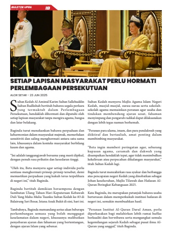 Sultan Kedah Al Aminul Karim Sultan Sallehuddin Sultan Badlishah bertitah bahawa segala perkara yang termaktub dalam Perlembagaan Persekutuan, hendaklah dihormati dan dipatuhi oleh setiap lapisan masyarakat tanpa mengira agama, bangsa dan latar belakang.Baginda turut menekankan bahawa perpaduan dan keharmonian dalam masyarakat majmuk, memerlukan sensitiviti dan saling menghormati antara satu sama lain, khususnya dalam konteks masyarakat berbilang kaum dan agama.%u201cIni adalah tanggungjawab bersama yang mesti dipikul, dengan penuh rasa prihatin dan kesedaran tinggi.%u201cOleh itu, Beta menyeru agar setiap individu perlu sentiasa menghormati prinsip-prinsip tersebut, demi memastikan perpaduan yang kukuh terus terpelihara di negeri ini,%u201d titah Baginda.Baginda bertitah demikian bersempena dengan Sambutan Ulang Tahun Hari Keputeraan Kebawah Duli Yang Maha Mulia Tuanku Sultan Kedah ke-83 di Balairung Seri Besar, Istana Anak Bukit di sini, hari ini.Tambahnya, Baginda memandang serius akan beberapa perkembangan semasa yang boleh menggugat keselamatan dalam negeri, khususnya melibatkan penyebaran ajaran dan fahaman yang bertentangan, dengan ajaran Islam yang sebenar.Sultan Kedah menyeru Majlis Agama Islam Negeri Kedah, masjid-masjid, surau-surau serta sekolahsekolah agama memainkan peranan agar usaha dan tindakan membendung ajaran sesat, fahaman menyimpang dan pengaruh radikal dapat dilaksanakan dengan lebih tegas namun berhemah.%u201cPeranan para ulama, imam, dan para pendakwah yang diiktiraf dan bertauliah, amat penting dalam membimbing masyarakat.%u201cBeta ingin memberi peringatan agar, sebarang kupasan agama, ceramah dan dakwah yang disampaikan hendaklah tepat, agar tidak menimbulkan kekeliruan atau perpecahan dikalangan masyarakat,%u201d titah Sultan Kedah lagi.Baginda turut menzahirkan rasa syukur dan berbangga atas pencapaian negeri Kedah yang dinobatkan sebagai Johan keseluruhan, Majlis Tilawah dan Hafazan AlQuran Peringkat Kebangsaan 2025.Kata Baginda, itu merupakan petunjuk bahawa usaha berterusan dalam memperkukuh institusi hafazan di negeri ini, semakin membuahkan hasil.%u201cPeranan Institut Al-Quran Darul Aman, perlu diperkasakan bagi melahirkan lebih ramai huffaz berkualiti dan berwibawa serta mengangkat semula kegemilangan sejarah Kedah sebagai pusat ilmu AlQuran yang unggul,%u201d titah Baginda.BULETIN UPDA EDISI MEI 2025 18SETIAP LAPISAN MASYARAKAT PERLU HORMATI PERLEMBAGAAN PERSEKUTUANALOR SETAR - 23 JUN 2025