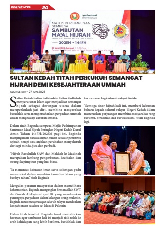 Sultan Kedah, Sultan Sallehuddin Sultan Badlishah menyeru umat Islam agar menjadikan semangat hijrah sebagai dorongan utama dalam memperkukuh jati diri, membina masyarakat berakhlak serta mempertahankan perpaduan ummah dalam menghadapi cabaran semasa.Dalam titah Baginda sempena Majlis Perhimpunan Sambutan Maal Hijrah Peringkat Negeri Kedah Darul Aman Tahun 1447H/2025M pagi ini, Baginda mengingatkan bahawa hijrah bukan sekadar peristiwa sejarah, tetapi satu anjakan perubahan menyeluruh dari segi minda, jiwa dan peribadi.%u201cHijrah Rasulullah SAW dari Makkah ke Madinah merupakan lambang pengorbanan, kecekalan dan strategi kepimpinan yang luar biasa.%u201cIa menuntut kekuatan iman serta sokongan padu masyarakat dalam membina tamadun Islam yang berdaya tahan,%u201d titah Baginda.Mengulas peranan masyarakat dalam memelihara keharmonian, Baginda mengangkat firman Allah SWT dari Surah Al-Hujurat ayat 10, yang menekankan pentingnya perpaduan dalam kalangan orang mukmin.Baginda turut menyeru agar seluruh rakyat mendoakan kesejahteraan saudara se-Islam di Palestin.Dalam titah tersebut, Baginda turut menzahirkan harapan agar sambutan kali ini menjadi titik tolak ke arah kehidupan yang lebih berilmu, berakhlak dan berwawasan bagi seluruh rakyat Kedah.%u201cSemoga sinar hijrah kali ini, memberi kekuatan baharu kepada seluruh rakyat Negeri Kedah dalam meneruskan perjuangan membina masyarakat yang berilmu, berakhlak dan berwawasan,%u201d titah Baginda lagi.BULETIN UPDA EDISI MEI 2025 20SULTAN KEDAH TITAH PERKUKUH SEMANGAT HIJRAH DEMI KESEJAHTERAAN UMMAHALOR SETAR - 27 JUN 2025