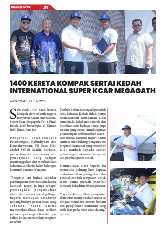 Sebanyak 1400 buah kereta kompak dari seluruh negara menyertai Kedah International Super Kcar Megagath Vol 4 Final Battle 2025 bertempat di Taman Jubli Emas, hari ini.P e n g e r u s i J a w a t a n k u a s a Pelancongan, Kebudayaan dan Keusahawanan, YB Dato%u2019 Haji Mohd Salleh Saidin berkata, penyertaan itu merupakan satu p e n c ap a i a n y a n g s a n g at membanggakan dan membuktikan kekuatan solidariti dalam kalangan komuniti automotif negara.%u201cProgram ini bukan sekadar perhimpunan peminat dunia kereta kompak, tetapi ia juga sebagai p e m a n g k i n p e n g u k u h a n silaturahim antara rakyat pelbagai negeri, memupuk kesedaran tentang budaya pemanduan yang s e l a m a t , s e r t a u n t u k memperkenalkan daya tarikan pelancongan negeri Kedah,%u201d ujar beliau ketika merasmikan program tersebut.Tambah beliau, ia menjadi petunjuk jelas bahawa Kedah tidak hanya menawarkan keindahan alam semulajadi, kehebatan sejarah dan keunikan seni budaya, tetapi juga medan yang sesuai untuk segmen pelancongan berkonsepkan acara.Jelas beliau, kerajaan negeri Kedah sentiasa mendukung penganjuran program komuniti yang memberi nilai tambah kepada sektor pelancongan, ekonomi tempatan dan pembangunan sosial.Menurutnya, acara seperti itu membuka peluang luas kepada usahawan mikro, peniaga kecil dan penjual produk tempatan untuk turut sama meraih manfaat daripada kehadiran ribuan pelawat.%u201cSaya berharap pihak penganjur akan terus memperkukuh usaha ini dengan membawa inovasi baharu dan penglibatan komuniti yang lebih luas pada masa akan datang,%u201d ujarnya.1400 KERETA KOMPAK SERTAI KEDAH INTERNATIONAL SUPER KCAR MEGAGATHALOR SETAR - 29 JUN 2025BULETIN UPDA EDISI MEI 2025 21