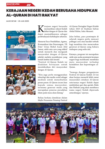 Kerajaan negeri berusaha memastikan rakyat Kedah dekat dengan al-Quran dan dapat menjadikannya sebagai pembudayaan kehidupan seharian.Menurut Exco Pendidikan, Agama, Komunikasi dan Penerangan, YB Dato%u2019 Ustaz Mohd Azam Abd Samat, salah satu cara yang efektif untuk menarik dan mengajak masyarakat dengan al-Quran adalah melalui pendekatan yang lemah lembut dan kreatif.%u201cFestival Al-Quran Kedah ini diadakan bertujuan untuk mendekatkan diri masyarakat dengan Al-Quran.%u201cKita juga perlu menggunakan teknologi dan media sosial sebagai medium untuk menyebarkan pesan-pesan Al-Quran secara luas kepada semua masyarakat, terutama generasi muda yang merupakan penerus peradaban Islam pada masa akan datang.%u201dBeliau berkata demikian dalam Majlis Perasmian Penutup Festival Al-Quran Peringkat Negeri Kedah tahun 2025 di Stadium Sultan Abdul Halim, Suka Menanti.Jelas beliau, para pemimpin di seluruh negara perlu mencari pelbagai cara atau kaedah terbaik bagi membina dan meneruskan generasi al-Quran yang baharu mahupun yang sedia ada.Katanya, program ini merupakan salah satu usaha pemimpin kerajaan negeri bagi membantu membuka mata masyarakat terhadap keindahan dan kepentingan alQuran.%u201cSemoga dengan penganjuran Festival Al-Quran Kedah 2.0 ini akan berjaya menarik lebih ramai masyarakat cintakan Al-Quran seterusnya negeri Kedah dapat melahirkan qari dan qariah, Hafiz dan Hafizah yang akan membawa nama negeri Kedah dipersada antarabangsa,%u201d ujarnya.KERAJAAN NEGERI KEDAH BERUSAHA HIDUPKAN AL-QURAN DI HATI RAKYATALOR SETAR - 29 JUN 2025BULETIN UPDA EDISI JUN 2025 22