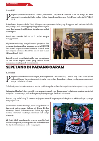 Pengerusi Jawatankuasa Sumber Manusia, Masyarakat Cina, India & Siam dan NGO, YB Wong Chia Zhen memenuhi jemputan ke Majlis Makan Malam Sukarelawan Simpanan Polis Diraja Malaysia (SSPDRM) 2025.Sukarelawan Simpanan Polis Diraja Malaysia merupakan satu badan yang dianggotai oleh individu-individu dari pelbagai latar belakang yang sanggup meluangkan masa dan tenaga demi khidmat kepada masyarakat serta negara.Komitmen mereka bukan kecil, malah sangat mengagumkan.Majlis malam ini juga menjadi simbol penyatuan dan semangat kekitaan dalam kalangan anggota SSPDRM dari seluruh negara termasuk Sabah dan Sarawak, serta bersempena sambutan Hari Polis ke-218 dan Tahun Melawat Kedah 2025.Tahniah kepada negeri Kedah selaku tuan rumah tahun ini dan syabas kepada semua yang terlibat dalam menjayakan majlis penuh bermakna ini.Pengerusi Jawatankuasa Pelancongan, Kebudayaan dan Keusahawanan, YB Dato%u2019 Haji Mohd Salleh Saidin melawati Padang Garam, kawasan tepi pantai yang sedang dalam fasa pertama pembangunannya sebagai tempat riadah dan rekreasi.Dahulu dipenuhi semak-samun dan terbiar, kini Padang Garam berubah wajah menjadi tumpuan orang ramai.Beliau dimaklumkan bahawa jumlah pengunjung, termasuk yang datang secara berkeluarga, semakin meningkat setiap hari, terutamanya pada waktu petang hujung minggu dan hari cuti umum.Suasana yang mula %u2018hidup%u2019 di kawasan itu juga secara tidak langsung membuka pintu rezeki kepada para peniaga dan penjaja kecil.Selain mahu melihat Padang Garam bangkit menjadi destinasi pelancongan baharu di Kuala Kedah khususnya dan di Kedah umumnya, beliau juga ingin melihat limpahan rezekinya dinikmati oleh warga setempat.YB Dato%u2019 Salleh akan berusaha seupaya mungkin bagi memastikan projek pembangunan fasa kedua kawasan itu dapat dilaksana pada kadar yang segera.SEPETANG DI PADANG GARAM3 JUN 20253 JUN 2025BULETIN UPDA EDISI JUN 2025 3