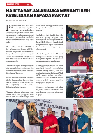 Projek menaik taraf Jalan Suka Menanti (K137) diyakini mampu meningkatkan penyampaian perkhidmatan serta merangsang pembangunan sosial ekonomi penduduk melalui penyediaan infrastruktur yang lebih baik.Menteri Besar Kedah, YAB Dato%u2019 Seri Muhammad Sanusi Md Nor berkata, kerjasama dan komitmen daripada semua pihak menjadi faktor utama dalam menjayakan dan melancarkan pelaksanaan sesuatu projek.%u201cIni harus menjadi petunjuk kepada kita semua bahawa kerjasama dan komitmen semua pihak sentiasa diperlukan,%u201d katanya.Beliau berkata demikian sewaktu Majlis Penyerahan Projek Siap, Projek Menaik Taraf Jalan Suka Menanti (K137) daerah Kota Setar di Stadium Suka Menanti.%u201cDengan adanya jalan raya yang dinaik taraf ini, pengguna dari dalam dan luar Bandaraya Alor Setar dapat menggunakan jalan dengan lebih selesa dan selamat,%u201d katanya.Tambahnya lagi, kualiti dan reka b e n t u k y a n g d i g u n a k a n menunjukkan bahawa Jabatan Kerja Raya (JKR) Negeri Kedah telah mengambil kira aspek keselamatan dan keselesaan pengguna pada tahap terbaik.Jelas beliau, Jalan Suka Menanti merupakan laluan utama yang menghubungkan masyarakat setempat dengan pusat bandar.%u201cSesungguhnya projek ini akan memberi banyak kemudahan kepada orang ramai, dan kita ucapkanlah syukur ke hadrat Allah SWT yang telah memberi kemudahan dan keizinan untuk semua pihak yang terlibat menyiapkan projek ini.%u201cSemoga usahasama ini akan berjalan demi keselasaan dan kesejahteraan pengguna jalan raya,%u201d ucapnya.NAIK TARAF JALAN SUKA MENANTI BERI KESELESAAN KEPADA RAKYATALOR SETAR - 3 JUN 2025BULETIN UPDA EDISI JUN 2025 4