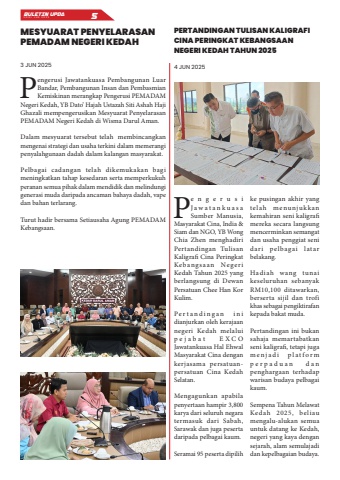 Pengerusi Jawatankuasa Pembangunan Luar Bandar, Pembangunan Insan dan Pembasmian Kemiskinan merangkap Pengerusi PEMADAM Negeri Kedah, YB Dato%u2019 Hajah Ustazah Siti Ashah Haji Ghazali mempengerusikan Mesyuarat Penyelarasan PEMADAM Negeri Kedah di Wisma Darul Aman.Dalam mesyuarat tersebut telah membincangkan mengenai strategi dan usaha terkini dalam memerangi penyalahgunaan dadah dalam kalangan masyarakat.Pelbagai cadangan telah dikemukakan bagi meningkatkan tahap kesedaran serta memperkukuh peranan semua pihak dalam mendidik dan melindungi generasi muda daripada ancaman bahaya dadah, vape dan bahan terlarang.Turut hadir bersama Setiausaha Agung PEMADAM Kebangsaan.Pe n g e r u s i J a w a t a n k u a s a Sumber Manusia, Masyarakat Cina, India & Siam dan NGO, YB Wong Chia Zhen menghadiri Pertandingan Tulisan Kaligrafi Cina Peringkat Kebangsaan Negeri Kedah Tahun 2025 yang berlangsung di Dewan Persatuan Chee Han Kor Kulim.P e r t a n d i n g a n i n i dianjurkan oleh kerajaan negeri Kedah melalui p e j a b a t E X C O Jawatankuasa Hal Ehwal Masyarakat Cina dengan kerjasama persatuanpersatuan Cina Kedah Selatan.Mengagunkan apabila penyertaan hampir 3,800 karya dari seluruh negara termasuk dari Sabah, Sarawak dan juga peserta daripada pelbagai kaum.Seramai 95 peserta dipilih ke pusingan akhir yang telah menunjukkan kemahiran seni kaligrafi mereka secara langsung mencerminkan semangat dan usaha penggiat seni dari pelbagai latar belakang.Hadiah wang tunai keseluruhan sebanyak RM10,100 ditawarkan, berserta sijil dan trofi khas sebagai pengiktirafan kepada bakat muda.Pertandingan ini bukan sahaja memartabatkan seni kaligrafi, tetapi juga m e n j a d i p l a t f o r m p e r p a d u a n d a n penghargaan terhadap warisan budaya pelbagai kaum.Sempena Tahun Melawat Kedah 2025, beliau mengalu-alukan semua untuk datang ke Kedah, negeri yang kaya dengan sejarah, alam semulajadi dan kepelbagaian budaya.MESYUARAT PENYELARASAN PEMADAM NEGERI KEDAHPERTANDINGAN TULISAN KALIGRAFI CINA PERINGKAT KEBANGSAAN NEGERI KEDAH TAHUN 20253 JUN 2025 4 JUN 2025BULETIN UPDA EDISI JUN 2025 5