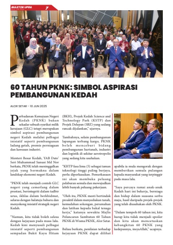 Perbadanan Kemajuan Negeri Kedah (PKNK) bukan sekadar sebuah syarikat milik kerajaan (GLC) tetapi merupakan simbol aspirasi pembangunan negeri Kedah melalui pelbagai inisiatif seperti pembangunan ladang getah, premis perniagaan dan kawasan industri.Menteri Besar Kedah, YAB Dato%u2019 Seri Muhammad Sanusi Md Nor berkata, PKNK telah meninggalkan jejak yang bermakna dalam landskap ekonomi negeri Kedah.%u201cPKNK telah menjadi contoh GLC negeri yang cemerlang dalam prestasi, berintegriti dalam tadbir urus, ikhlas dalam berkhidmat, selaras dengan halatuju baharu dan menyokong inisiatif strategik negeri Kedah.%u201cNamun, kita tidak boleh selesa dengan kejayaan pada masa lalu. Kedah kini menyusuli pelbagai inisiatif seperti pembangunan sempadan Bukit Kayu Hitam (BKH), Projek Kedah Science and Technology Park (KSTP) dan Projek Delepan (SBZ) yang sedang rancak dijalankan,%u201d ujarnya.Tambahnya, selain pembangunan lapangan terbang kargo, PKNK b o l e h m e n c e bu r i bi d a n g pembangunan hartanah, industri dan logistik di sekitar aerotropolis yang sedang kita usahakan.%u201cKHTP fasa lima (5) sebagai taman teknologi tinggi paling berjaya, perlu diperkasakan. Pemerkasaan ini akan membuka peluang pelaburan semula dan mewujudkan lebih banyak peluang pekerjaan.%u201cOleh itu, PKNK mesti bertindak proaktif dalam menyediakan tanah, kemudahan sokongan, perumahan dan latihan kepada bakal tenaga kerja,%u201d katanya sewaktu Majlis Pelancaran Sambutan 60 Tahun PKNK di Wisma PKNK, Alor Setar.Beliau berkata, penilaian terhadap kejayaan PKNK dapat dilihat apabila ia mula mengorak dengan memberikan semula pulangan kepada masyarakat yang terpinggir pada masa lalu.%u201cSaya percaya ramai anak-anak Kedah hari ini bekerja, berniaga dan hidup dalam suasana serba maju, hasil daripada projek-projek yang telah diusahakan oleh PKNK.%u201cDalam tempoh 60 tahun ini, kita harap kita tidak menjadi spoiler dan kita akan mencetuskan kebangkitan 60 PKNK yang kedepannya, insyaAllah,%u201d ucapnya.60 TAHUN PKNK: SIMBOL ASPIRASI PEMBANGUNAN KEDAHALOR SETAR - 10 JUN 2025BULETIN UPDA EDISI JUN 2025 7