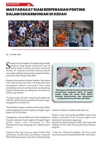 Sambutan Pesta Songkran Peringkat Negeri Kedah memberi ruang kepada masyarakat Siam di Kedah untuk meraikan perayaan tradisional mereka, di samping membuka peluang kepada masyarakat pelbagai kaum untuk mengenali budaya masyarakat Siam dengan lebih dekat.Pengerusi Jawatankuasa Sumber Manusia, Masyarakat Cina, India & Siam dan NGO, YB Wong Chia Zhen menegaskan bahawa masyarakat Siam telah memainkan peranan penting dalam menyumbang kepada keharmonian, pembangunan dan kekayaan budaya negeri Kedah.%u201cKerajaan negeri tak perlu cakap banyak apabila ada individu tertentu bertanya pendirian kerajaan negeri menganjurkan sambutan itu.%u201cKita buktikan dengan tindakan dan buat kerja ikhlas untuk menganjurkan pesta songkran peringkat negeri Kedah 2025 di Wat Kura.Dianggarkan seramai 8000 kaum Siam menghadiri Program Sambutan Pesta Songkran Peringkat Negeri Kedah Tahun 2025 b er tempat di Wat ffammasiriwararam Kampung Kura, Mukim Jeneri, hari ini.Tambah beliau lagi, kerajaan negeri Kedah telah meluluskan keseluruhan peruntukan sebanyak RM70,000 kepada lapan buah Wat di seluruh Kedah sempena sambutan Songkran pada tahun ini.Jelasnya, bagi menyokong pendidikan agama dan budaya masyarakat Siam, kerajaan negeri turut meluluskan bantuan kewangan bagiPeperiksaan Kelas Dhamma Tahun 2025 yang telah diadakan di Wat Teluk Wanjah pada bulan Februari yang lalu.%u201cSelain itu, Tabung Pendidikan Wat Kura turut menerima bantuan berjumlah RM5,000,%u201d kata beliau.MASYARAKAT SIAM BERPERANAN PENTING DALAM KEHARMONIAN DI KEDAHSIK- 19 APRIL 2025BULETIN UPDA EDISI APRIL 2025 12%u201cWalaupun individu tersebut partinya telah memerintah berpuluh tahun di negeri Kedah, tetapi dia masih tidak faham tentang keharmonian dan perpaduan masyarakat komuniti Siam di Kedah,%u201d