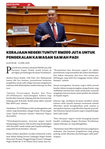 Permohonan tuntutan sebanyak RM200 juta oleh Kerajaan Negeri Kedah masih berada di peringkat pertimbangan Kerajaan Persekutuan.Menteri Besar Kedah, YAB Dato%u2019 Seri Muhammad Sanusi Md Nor berkata, permohonan berkaitan pengekalan sawah padi sebagai kawasan pengeluaran makanan telah dikemukakan melalui beberapa siri libat urus.%u201cJabatan Perancangan Bandar dan Desa (PLANMalaysia) mencadangkan bahawa bagi keseluruhan kawasan jelapang padi dan kawasan luar jelapang padi di Kedah, Kedah patut diberi insentif khas RM41 juta,%u201d katanya.Tambahnya, PLANMalaysia telah membangunkan satu sistem yang dinamakan sebagai Kajian Perancangan Guna Tanah Kawasan Sumber Makanan Negara (KaGuMN).%u201cWalaubagaimanapun, kerajaan negeri masih berpandangan bahawa nilai insentif yang dicadangkan oleh KaGuMN masih terlalu jauh kepada kehilangan yang telah kita korbankan,%u201d jelasnya.Beliau berkata demikian sewaktu menjawab soalan lisan dalam Sidang Dewan Undangan Negeri Kedah Mesyuarat Pertama Penggal Ketiga Dewan Undangan Negeri Kedah Ke-15 di Wisma Darul Aman, hari ini.%u201cPermohonan kita (kerajaan negeri) ini adalah permohonan yang munasabah dan bukan keterlaluan, kita bukan menuntut duit free, kita tuntut atas kehilangan yang telah kita tanggung ratusan tahun lamanya,%u201d ujarnya.Sanusi menegaskan, kerajaan negeri tidak pernah kendur dalam memperjuangkan pengorbanan yang melibatkan kawasan luas tanah sawah padi, termasuk pengekalan kawasan hutan untuk tadahan dan bekalan air kepada negara.Jelasnya lagi, meskipun kerajaan memberi alasan bahawa telah banyak bantuan berbentuk subsidi diberikan untuk menghasilkan padi, namun ia merupakan bantuan yang diberikan kepada pesawah, dan bukannya kepada kerajaan negeri yang kehilangan hasil cukai tanah.%u201cKita (kerajaan negeri) masih berpegang kepada kaedah rundingan dengan Kerajaan Persekutuan selepas beberapa siri yang dibangkitkan.%u201cKeutamaan mesti diberi kepada kawasan pengeluaran makanan, dan kawasan pengeluaran yang paling penting untuk diberikan pertimbangan ialah padi,%u201d ucapnya.KERAJAAN NEGERI TUNTUT RM200 JUTA UNTUK PENGEKALAN KAWASAN SAWAH PADIALOR SETAR - 21 APRIL 2025BULETIN UPDA EDISI APRIL 2025 17