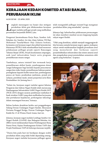 Langkah menangani isu banjir dan mitigasi perubahan iklim giat dilaksanakan kerajaan negeri melalui pelbagai projek yang melibatkan peruntukan berjumlah RM60.2 juta.Pengerusi Jawatankuasa Kerja Raya, Sumber Asli, Bekalan Air, Sumber Air dan Alam Sekitar, YB Haji Mohamad Yusuf@Munir Haji Zakaria berkata, kerjasama erat kerajaan negeri dan pihak kementerian khususnya PETRA telah membuahkan hasil menerusi pelaksanaan pelbagai projek seperti Rancangan Tebatan Banjir (RTB), Projek keselamatan empangan, naik taraf infrastruktur banjir serta program pemuliharaan muara sungai.Tambahnya, antara inisiatif lain termasuk kerja pemuliharaan akibat banjir, pembangunan denai sungai kebangsaan bagi kawalan kepada pencemaran sungai dan risiko banjir, pemuliharaan hakisan pantai, peningkatan kapasiti fasiliti taman laut, pembangunan punca air bumi, pembaikan jambatan, projek jeti nelayan, perolehan tanah, sistem perparitan serta Skim Pemindahan Air Jeniang fasa 1.%u201cSelain itu, kerajaan negeri melalui agensi Jabatan Pengairan dan Saliran Negeri Kedah telah merancang Pembangunan Infrastruktur SABO Negeri Kedah 2035 (PICK 2035) dengan sasaran pembinaan tambahan 8 buah struktur SABO yang akan melibatkan kerjasama dan pertukaran kepakaran, perkongsian teknologi dalam menangani bencana,%u201d katanya.Beliau berkata demikian ketika sesi penggulungan Sidang Dewan Undangan Negeri Kedah, Mesyuarat Pertama Penggal Ketiga, Dewan Undangan Negeri Kedah Ke-15 di Wisma Darul Aman, hari ini.Jelasnya, kerajaan negeri melalui Lembaga Sumber Air Negeri Kedah (LSANK) dan Bahagian Bekalan Air (BBA) turut melaksanakan Kajian Pembangunan Baraj Pantai Perai, Kajian Pembangunan Kolam TAPS dan Projek Pembinaan TAPS di beberapa kawasan terpilih.%u201cDunia kita pada hari ini berdepan dengan realiti perubahan iklim yang tidak boleh dipandang enteng. Kerajaan negeri melalui kerjasama pelbagai agensi telah mengambil pelbagai inisiatif bagi mengatasi perubahan iklim yang mendadak,%u201d ujarnya.Jelasnya lagi, keberhasilan pelaksanaan perancangan ini akan memberi manfaat secara langsung kepada rakyat negeri Kedah.%u201cOleh yang demikian, adalah menjadi tanggungjawab kita bersama samada kerajaan negeri, agensi, mahupun rakyat untuk melaksanakan langkah persediaan awal yang menyeluruh dan berkesan seperti penambahbaikan infrastruktur dan sistem amaran awal dan pengukuhan pusat pemindahan sementera oleh agensi yang berkaitan,%u201d ucapnya.KERAJAAN KEDAH KOMITED ATASI BANJIR, PERUBAHAN IKLIMALOR SETAR - 23 APRIL 2025BULETIN UPDA EDISI APRIL 2025 24Sumber: Google