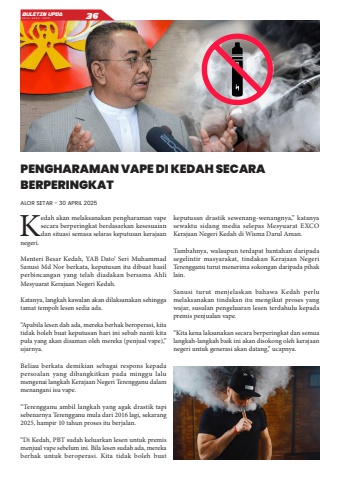 Kedah akan melaksanakan pengharaman vape secara berperingkat berdasarkan kesesuaian dan situasi semasa selaras keputusan kerajaan negeri.Menteri Besar Kedah, YAB Dato%u2019 Seri Muhammad Sanusi Md Nor berkata, keputusan itu dibuat hasil perbincangan yang telah diadakan bersama Ahli Mesyuarat Kerajaan Negeri Kedah.Katanya, langkah kawalan akan dilaksanakan sehingga tamat tempoh lesen sedia ada.%u201cApabila lesen dah ada, mereka berhak beroperasi, kita tidak boleh buat keputusan hari ini sebab nanti kita pula yang akan disaman oleh mereka (penjual vape),%u201d ujarnya.Beliau berkata demikian sebagai respons kepada persoalan yang dibangkitkan pada minggu lalu mengenai langkah Kerajaan Negeri Terengganu dalam menangani isu vape.%u201cTerengganu ambil langkah yang agak drastik tapi sebenarnya Terengganu mula dari 2016 lagi, sekarang 2025, hampir 10 tahun proses itu berjalan.%u201cDi Kedah, PBT sudah keluarkan lesen untuk premis menjual vape sebelum ini. Bila lesen sudah ada, mereka berhak untuk beroperasi. Kita tidak boleh buat keputusan drastik sewenang-wenangnya,%u201d katanya sewaktu sidang media selepas Mesyuarat EXCO Kerajaan Negeri Kedah di Wisma Darul Aman.Tambahnya, walaupun terdapat bantahan daripada segelintir masyarakat, tindakan Kerajaan Negeri Terengganu turut menerima sokongan daripada pihak lain.Sanusi turut menjelaskan bahawa Kedah perlu melaksanakan tindakan itu mengikut proses yang wajar, susulan pengeluaran lesen terdahulu kepada premis penjualan vape.%u201cKita kena laksanakan secara berperingkat dan semua langkah-langkah baik ini akan disokong oleh kerajaan negeri untuk generasi akan datang,%u201d ucapnya.PENGHARAMAN VAPE DI KEDAH SECARA BERPERINGKATALOR SETAR - 30 APRIL 2025BULETIN UPDA EDISI APRIL 2025 36