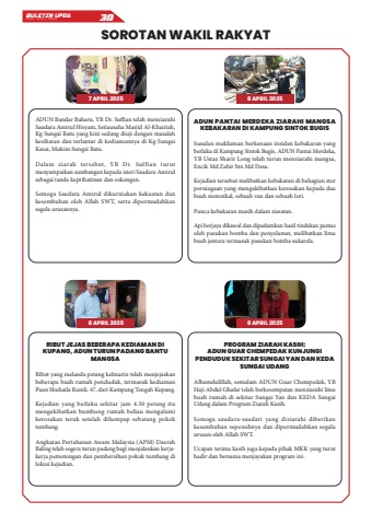SOROTAN WAKIL RAKYATBULETIN UPDA EDISI APRIL 2025 388 APRIL 2025 8 APRIL 2025ADUN PANTAI MERDEKA ZIARAHI MANGSA KEBAKARAN DI KAMPUNG SINTOK BUGISSusulan makluman berkenaan insiden kebakaran yang berlaku di Kampung Sintok Bugis, ADUN Pantai Merdeka, YB Ustaz Sharir Long telah turun menziarahi mangsa, Encik Md Zahir bin Md Desa.Kejadian tersebut melibatkan kebakaran di bahagian stor perniagaan yang mengakibatkan kerosakan kepada dua buah motosikal, sebuah van dan sebuah lori.Punca kebakaran masih dalam siasatan.Api berjaya dikawal dan dipadamkan hasil tindakan pantas oleh pasukan bomba dan penyelamat, melibatkan lima buah jentera termasuk pasukan bomba sukarela.PROGRAM ZIARAH KASIH:ADUN GUAR CHEMPEDAK KUNJUNGI PENDUDUK SEKITAR SUNGAI YAN DAN KEDA SUNGAI UDANGAlhamdulillah, semalam ADUN Guar Chempedak, YB Haji Abdul Ghafar telah berkesempatan menziarahi lima buah rumah di sekitar Sungai Yan dan KEDA Sungai Udang dalam Program Ziarah Kasih.Semoga saudara-saudari yang diziarahi diberikan kesembuhan sepenuhnya dan dipermudahkan segala urusan oleh Allah SWT.Ucapan terima kasih juga kepada pihak MKK yang turut hadir dan bersama menjayakan program ini.ADUN Bandar Baharu, YB Dr. Su%u001aan telah menziarahi Saudara Amirul Hisyam, Setiausaha Masjid Al-Khairiah, Kg Sungai Batu yang kini sedang diuji dengan masalah kesihatan dan terlantar di kediamannya di Kg Sungai Kasai, Mukim Sungai Batu.Dalam ziarah tersebut, YB Dr. Suffian turut menyampaikan sumbangan kepada isteri Saudara Amirul sebagai tanda keprihatinan dan sokongan.Semoga Saudara Amirul dikurniakan kekuatan dan kesembuhan oleh Allah SWT, serta dipermudahkan segala urusannya.RIBUT JEJAS BEBERAPA KEDIAMAN DI KUPANG, ADUN TURUN PADANG BANTU MANGSARibut yang melanda petang kelmarin telah menjejaskan beberapa buah rumah penduduk, termasuk kediaman Puan Shuhaila Ramli, 47, dari Kampung Tengah Kupang.Kejadian yang berlaku sekitar jam 4.30 petang itu mengakibatkan bumbung rumah beliau mengalami kerosakan teruk setelah dihempap sebatang pokok tumbang.Angkatan Pertahanan Awam Malaysia (APM) Daerah Baling telah segera turun padang bagi menjalankan kerjakerja pemotongan dan pembersihan pokok tumbang di lokasi kejadian.7 APRIL 2025 8 APRIL 2025