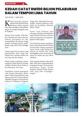 Kedah mencatat kejayaan apabila lebih RM100 bilion pelaburan dalam tempoh lima tahun sekaligus membuktikan negeri ini sedang melangkah maju ke hadapan.Menteri Besar Kedah, YAB Dato%u2019 Seri Muhammad Sanusi Md Nor berkata, pencapaian ini jelas menunjukkan keyakinan tinggi pelabur terhadap potensi negeri Kedah sejak tahun 2020 sehingga 2025.%u201cKalau negeri kita ni seperti yang digambarkan oleh orang lain kepada kita, tentulah pelabur tak mai, depa tak akan datang.Beliau berkata sedemikian semasa sambutan Majlis Rumah Terbuka Aidilfitri Menteri Besar Kedah di Seri Mentaloon, Alor Setar.Tambahnya, banyak pencapaian telah dicapai khususnya dalam sektor industri dan pelaburan yang diketuai oleh YB Dr. Haim Hilman Abdullah (Pengerusi Jawatankuasa Industri & Pelaburan, Pengajian Tinggi, Sains, Teknologi & Inovasi), dengan jumlah pelaburan pada tahun ini dicatatkan sebanyak RM44.1 bilion.Sanusi turut berharap agar sokongan terhadap pembangunan negeri Kedah berterusan terutama menerusi kerjasama erat pegawaipegawai tadbir negeri.%u201cSaya harap ketenangan, perpaduan, bisnes yang sedang rancak di Kedah ini berterusan dengan perpaduan antara kaum yang sedang kita nikmati di Kedah, kita tidak meninggalkan mana-mana kaum di negeri ini dalam apa-apa sektor sekalipun.%u201cJanji yang kita letakkan tahun 2020 dulu, tidak akan menganaktirikan sesiapapun di negeri ini, kerana kita meletakkan slogan %u201cKedah Sejahtera, Nikmat Untuk Semua%u201d, tiada yang akan terpinggir,%u201d ucapnya.Pelabur sebelum meletakkan modal yang begitu besar dalam satu-satu industri, dia buat kajian, ahli lembaga pengarah syarikat, dia ada ejen yang akan membuat cadangan-cadangan, di manakah pelaburan yang paling sesuai untuk diletakkan modal,KEDAH CATAT RM100 BILION PELABURAN DALAM TEMPOH LIMA TAHUNALOR SETARI - 7 APRIL 2025BULETIN UPDA EDISI APRIL 2025 2025 3