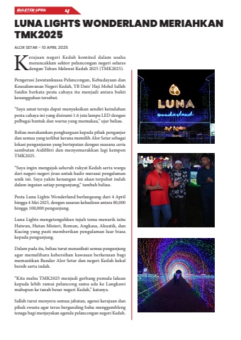 Kerajaan negeri Kedah komited dalam usaha merancakkan sektor pelancongan negeri selaras dengan Tahun Melawat Kedah 2025 (TMK2025).Pengerusi Jawatankuasa Pelancongan, Kebudayaan dan Keusahawanan Negeri Kedah, YB Dato%u2019 Haji Mohd Salleh Saidin berkata pesta cahaya itu menjadi antara bukti kesungguhan tersebut.%u201cSaya amat teruja dapat menyaksikan sendiri keindahan pesta cahaya ini yang disirami 1.6 juta lampu LED dengan pelbagai bentuk dan warna yang memukau,%u201d ujar beliau.Beliau merakamkan penghargaan kepada pihak penganjur dan semua yang terlibat kerana memilih Alor Setar sebagai lokasi penganjuran yang bertepatan dengan suasana ceria sambutan Aidilfitri dan menyemarakkan lagi kempen TMK2025.%u201cSaya ingin mengajak seluruh rakyat Kedah serta warga dari negeri-negeri jiran untuk hadir merasai pengalaman unik ini. Saya yakin kenangan ini akan terpahat indah dalam ingatan setiap pengunjung,%u201d tambah beliau.Pesta Luna Lights Wonderland berlangsung dari 4 April hingga 4 Mei 2025, dengan sasaran kehadiran antara 80,000 hingga 100,000 pengunjung.Luna Lights mengetengahkan tujuh tema menarik iaitu Haiwan, Hutan Misteri, Roman, Angkasa, Akuatik, dan Kucing yang pasti memberikan pengalaman luar biasa kepada pengunjung.Dalam pada itu, beliau turut menasihati semua pengunjung agar memelihara kebersihan kawasan berkenaan bagi memastikan Bandar Alor Setar dan negeri Kedah kekal bersih serta indah.%u201cKita mahu TMK2025 menjadi gerbang pemula laluan kepada lebih ramai pelancong sama ada ke Langkawi mahupun ke tanah besar negeri Kedah,%u201d katanya.Salleh turut menyeru semua jabatan, agensi kerajaan dan pihak swasta agar terus berganding bahu menggembleng tenaga bagi menjayakan agenda pelancongan negeri Kedah.LUNA LIGHTS WONDERLAND MERIAHKAN TMK2025ALOR SETAR - 10 APRIL 2025BULETIN UPDA EDISI APRIL 2025 4