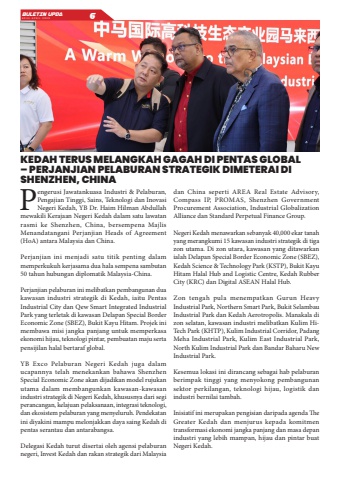 Pengerusi Jawatankuasa Industri & Pelaburan, Pengajian Tinggi, Sains, Teknologi dan Inovasi Negeri Kedah, YB Dr. Haim Hilman Abdullah mewakili Kerajaan Negeri Kedah dalam satu lawatan rasmi ke Shenzhen, China, bersempena Majlis Menandatangani Perjanjian Heads of Agreement (HoA) antara Malaysia dan China.Perjanjian ini menjadi satu titik penting dalam memperkukuh kerjasama dua hala sempena sambutan 50 tahun hubungan diplomatik Malaysia-China.Perjanjian pelaburan ini melibatkan pembangunan dua kawasan industri strategik di Kedah, iaitu Pentas Industrial City dan Qew Smart Integrated Industrial Park yang terletak di kawasan Delapan Special Border Economic Zone (SBEZ), Bukit Kayu Hitam. Projek ini membawa misi jangka panjang untuk memperkasa ekonomi hijau, teknologi pintar, pembuatan maju serta pensijilan halal bertaraf global.YB Exco Pelaburan Negeri Kedah juga dalam ucapannya telah menekankan bahawa Shenzhen Special Economic Zone akan dijadikan model rujukan utama dalam membangunkan kawasan-kawasan industri strategik di Negeri Kedah, khususnya dari segi perancangan, kelajuan pelaksanaan, integrasi teknologi, dan ekosistem pelaburan yang menyeluruh. Pendekatan ini diyakini mampu melonjakkan daya saing Kedah di pentas serantau dan antarabangsa.Delegasi Kedah turut disertai oleh agensi pelaburan negeri, Invest Kedah dan rakan strategik dari Malaysia dan China seperti AREA Real Estate Advisory, Compass IP, PROMAS, Shenzhen Government Procurement Association, Industrial Globalization Alliance dan Standard Perpetual Finance Group.Negeri Kedah menawarkan sebanyak 40,000 ekar tanah yang merangkumi 15 kawasan industri strategik di tiga zon utama. Di zon utara, kawasan yang ditawarkan ialah Delapan Special Border Economic Zone (SBEZ), Kedah Science & Technology Park (KSTP), Bukit Kayu Hitam Halal Hub and Logistic Centre, Kedah Rubber City (KRC) dan Digital ASEAN Halal Hub.Zon tengah pula menempatkan Gurun Heavy Industrial Park, Northern Smart Park, Bukit Selambau Industrial Park dan Kedah Aerotropolis. Manakala di zon selatan, kawasan industri melibatkan Kulim HiTech Park (KHTP), Kulim Industrial Corridor, Padang Meha Industrial Park, Kulim East Industrial Park, North Kulim Industrial Park dan Bandar Baharu New Industrial Park.Kesemua lokasi ini dirancang sebagai hab pelaburan berimpak tinggi yang menyokong pembangunan sektor perkilangan, teknologi hijau, logistik dan industri bernilai tambah.Inisiatif ini merupakan pengisian daripada agenda ffe Greater Kedah dan menjurus kepada komitmen transformasi ekonomi jangka panjang dan masa depan industri yang lebih mampan, hijau dan pintar buat Negeri Kedah.BULETIN UPDA EDISI APRIL 2025 6KEDAH TERUS MELANGKAH GAGAH DI PENTAS GLOBAL %u2013 PERJANJIAN PELABURAN STRATEGIK DIMETERAI DI SHENZHEN, CHINA