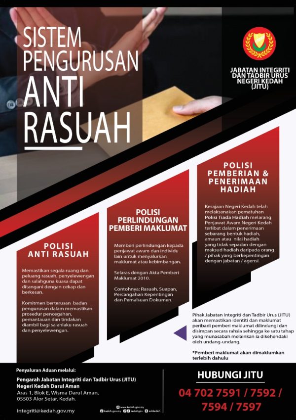 Sistem tadbir urus sektor awam yang terbaik dan budaya kerja berkualiti merupakan landasan penting dalam meningkatkan keyakinan rakyat terhadap keupayaan kerajaan melaksanakan dasar yang dimandatkan. Komitmen kerajaan dalam meningkatkan integriti dan mengekang jenayah rasuah di kalangan pegawai awam jelas menerusi pelaksanaan pelbagai dasar dan program yang diperkenalkan sejak sedekad lalu. Antaranya menjadikan rasuah sebagai salah satu daripada bidang penting yang ditekankan dalam Pelan Transformasi Kerajaan (GTP) menerusi Bidang Keberhasilan Utama Negara atau NKRA Berkaitan Rasuah.